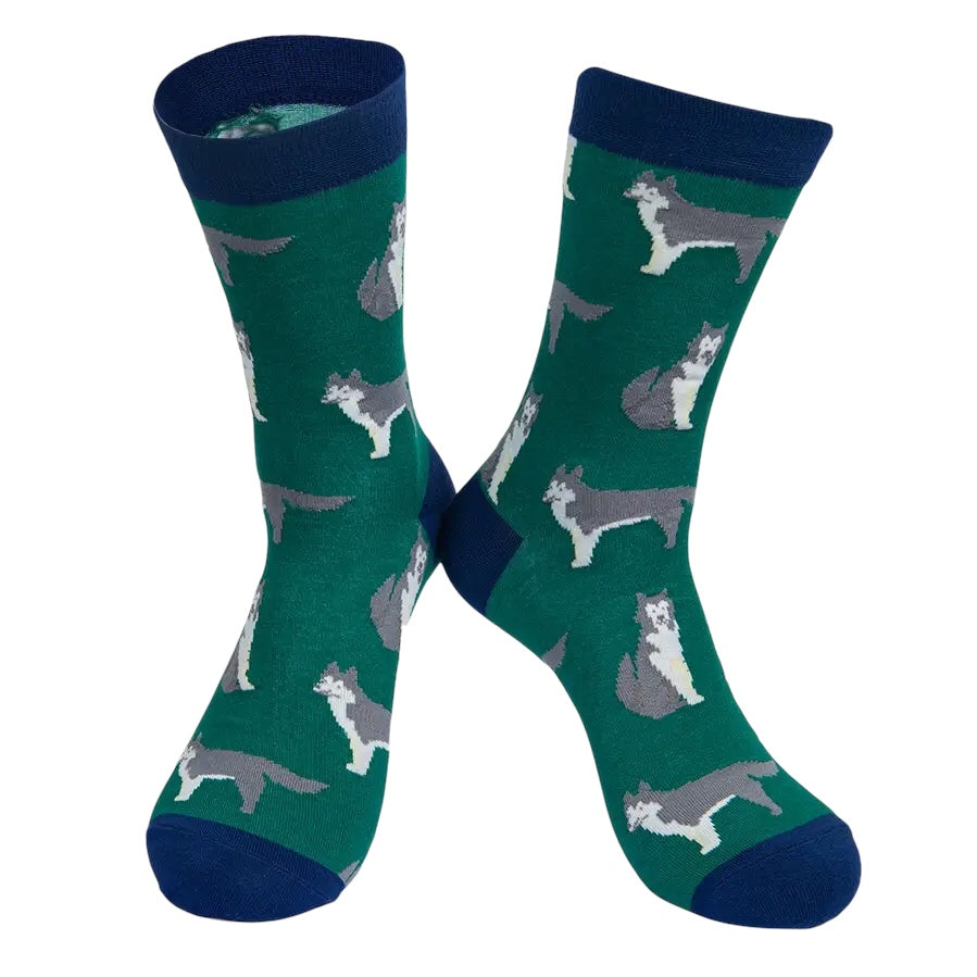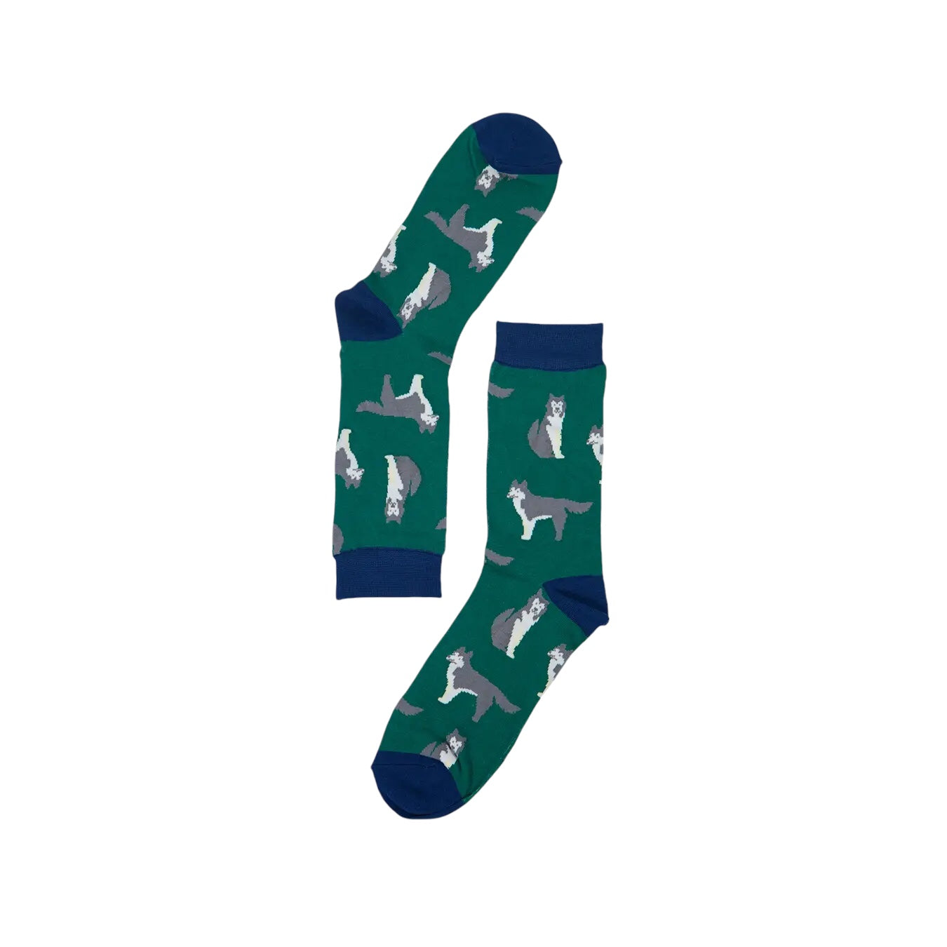 🐾Säg det med en strumpa!! Mönstrad bambustrumpa. Perfekt present till en älskad hundägare. Grön och blå design med Siberian Huskys. Dessutom i det fantastiska materialet bambu!!