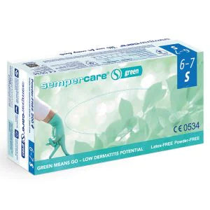 Nitrilhandske Semperguard Green acceleratorfri - S är en miljövänligare engångshandske som både är hudvänlig samt ger ett överlägset skydd mot blodburna smittor och virus. Nitrilhandsken är latexfri samt tillverkad utan gummiacceleratorer vilket minskar risken för fördröjda överkänslighetsreaktioner (hudirritationer) som orsakas av rester av acceleratorer som exempelvis tiuramer, karbamater och tiazoler.