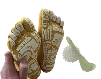 Under fötterna finns tusentals reflexpunkter. Reflexpunkterna på fötterna representerar kroppens olika organ och kroppsdelar. Ett distinkt tryck på dessa punkter leder till en reaktion i det område som zonen motsvarar. Undersidan av våra strumpor har en karta över zonerna med symboler och text på svenska. Genom att massera och trycka på ett visst område i zonerna med de medföljande redskapen stimulerar du nervtrådarna under fötterna. Att massera och trycka på zoner under fötterna främjar din hälsa på flera sätt: