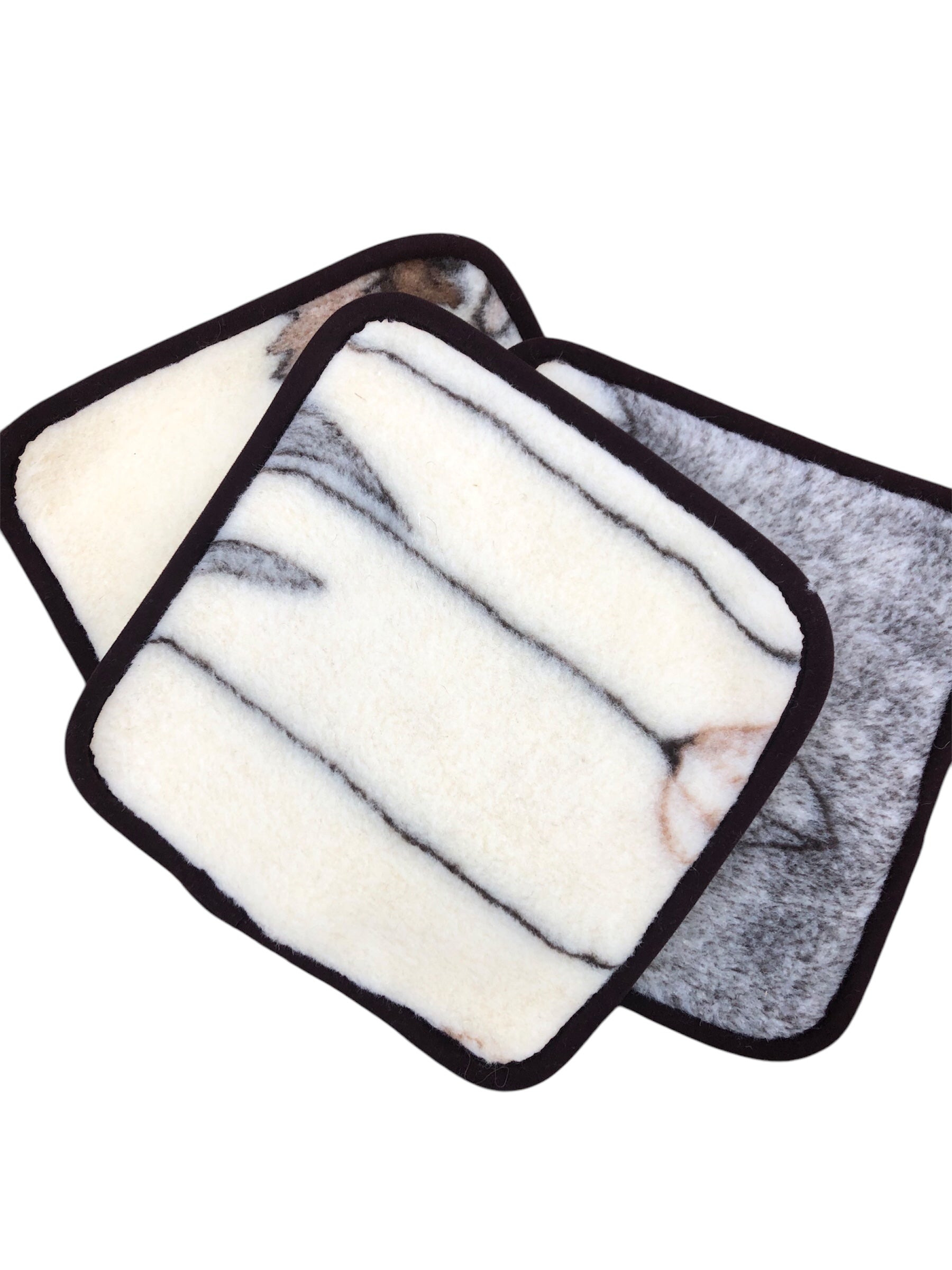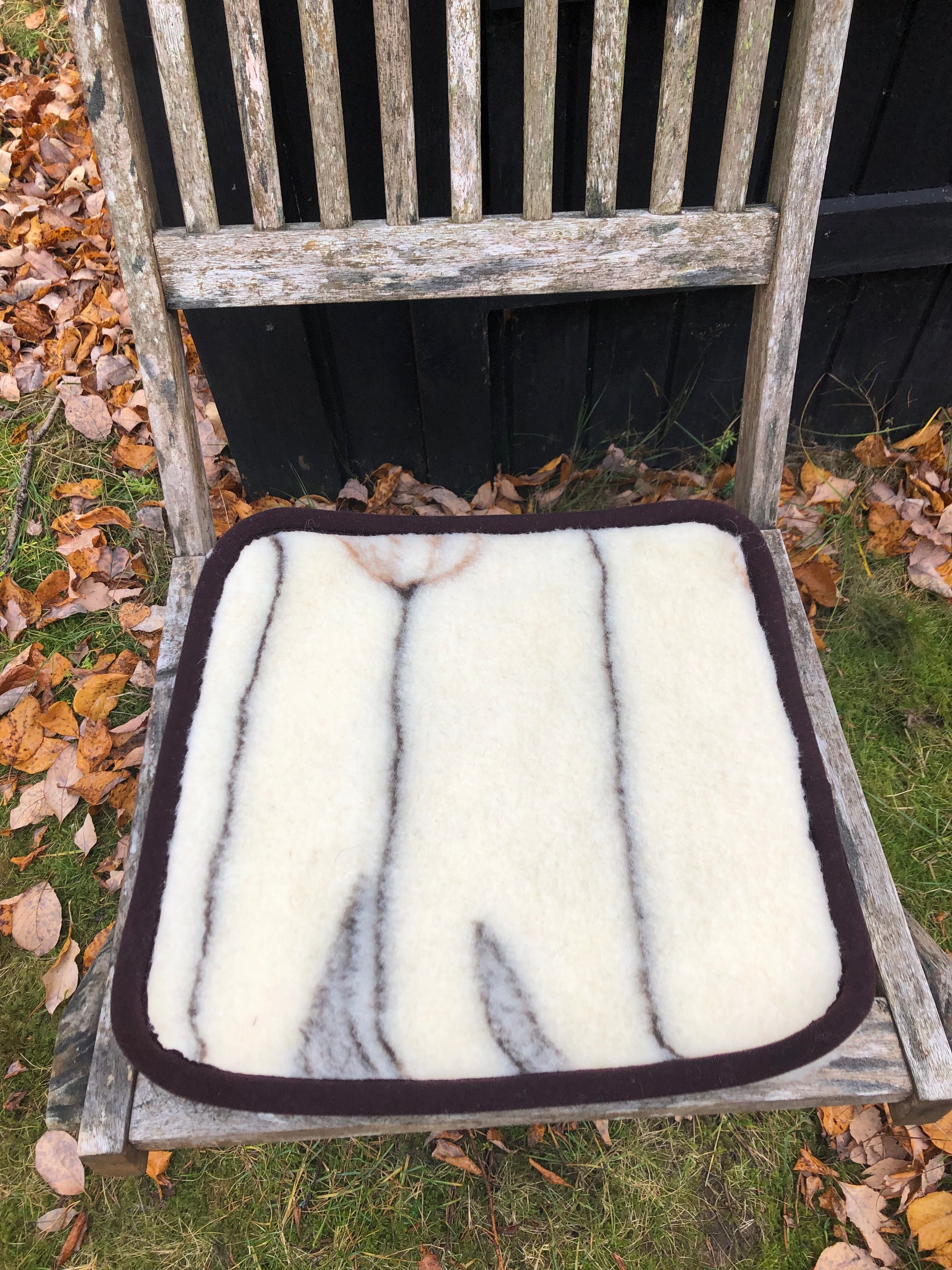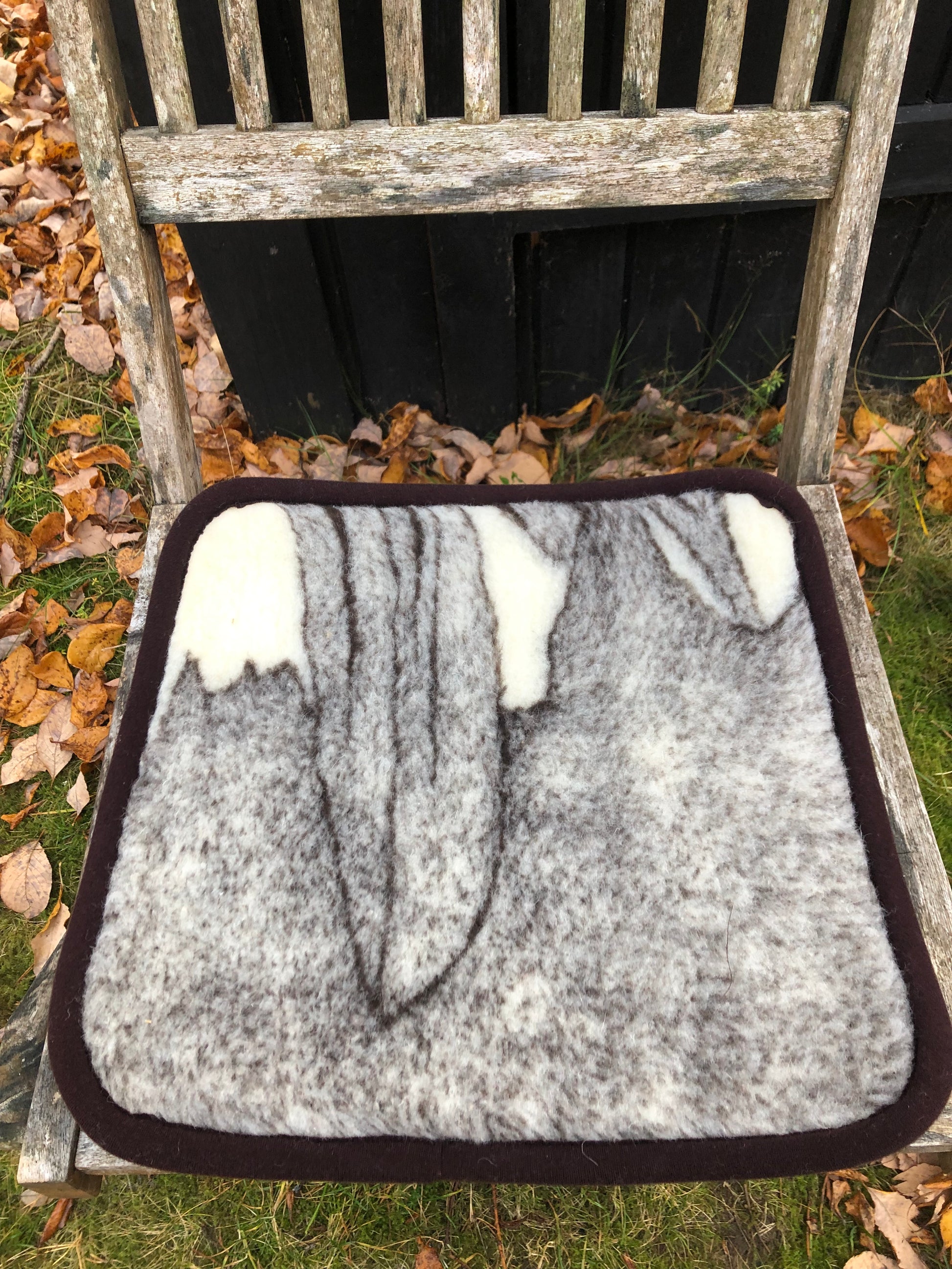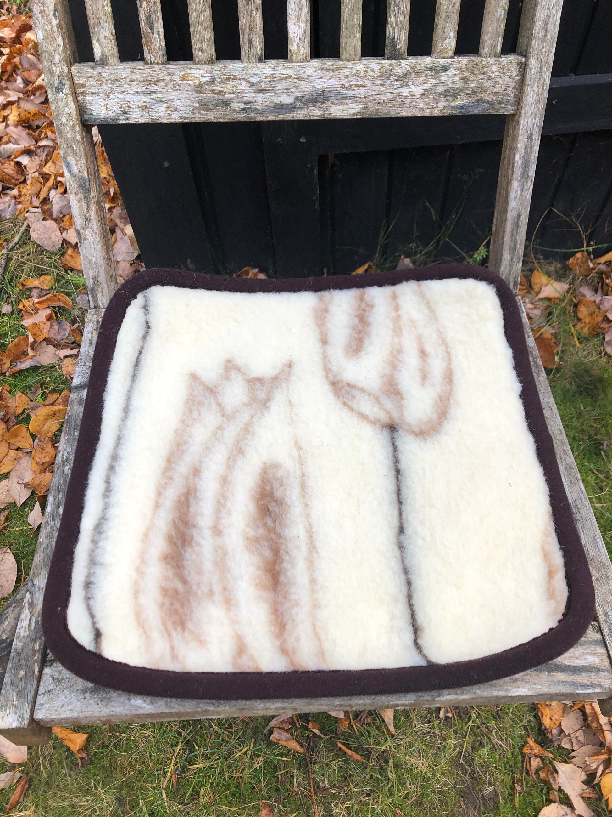 Sittdyna i ull 39x39cm - osorterade mönster i brunt och naturvit. Enfärgad baksida i naturvitt.