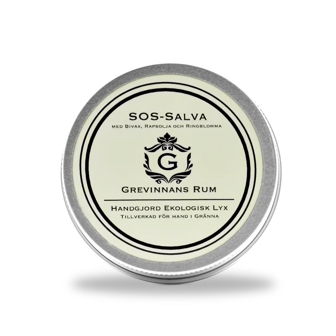 Bivax, Ringblomsolja, rapsolja allt från Sverige. Lavendeloljan har vi fått hem från vackra Provence. Doften är mild, mjuk och magisk. SOS Salvan kan användas till allt. Det är därför den är SOS. Den passar till torra läppar, spruckna hälar, nagelband. Perfekt till sträva nävar och vassa armbågar.