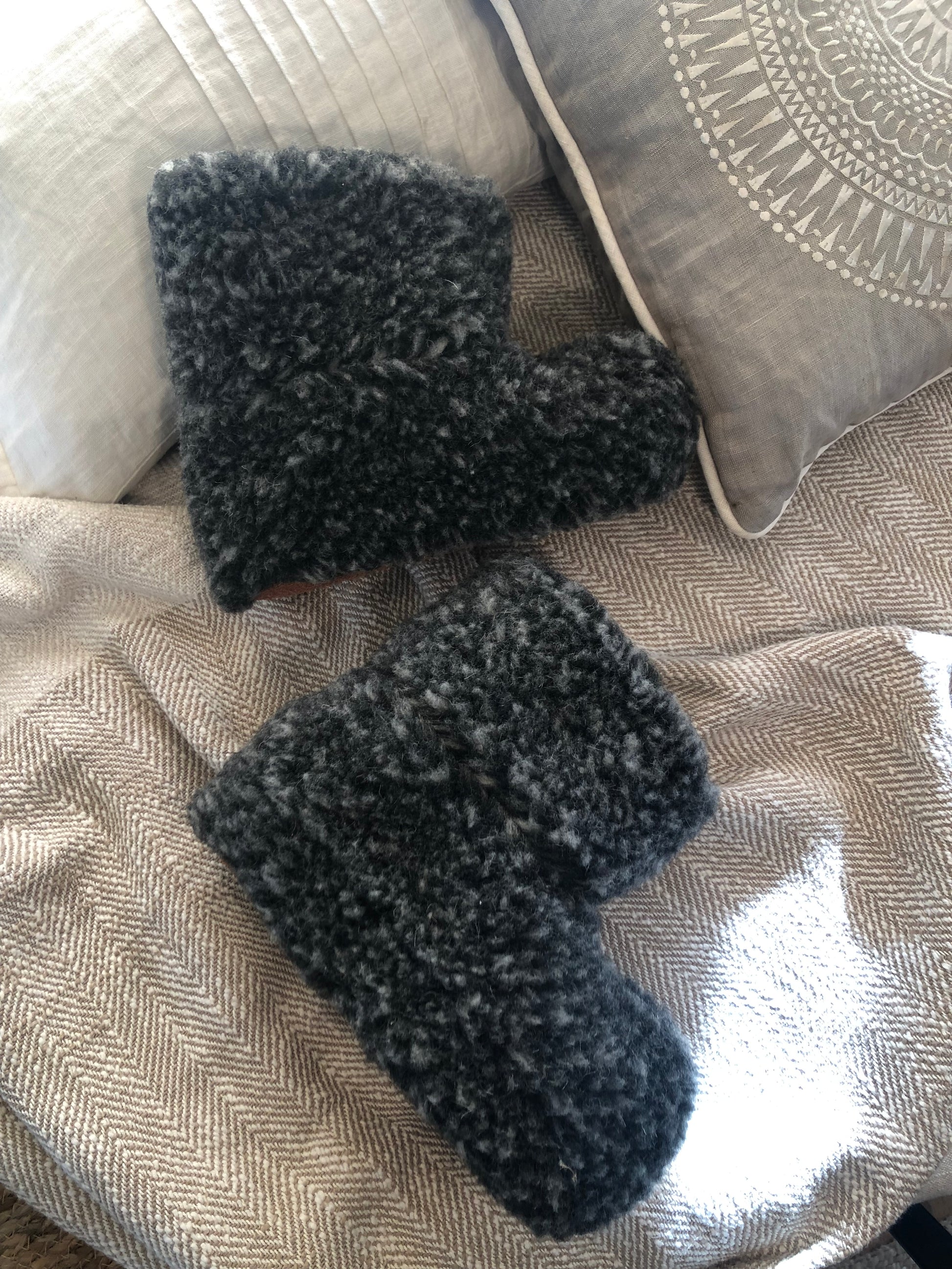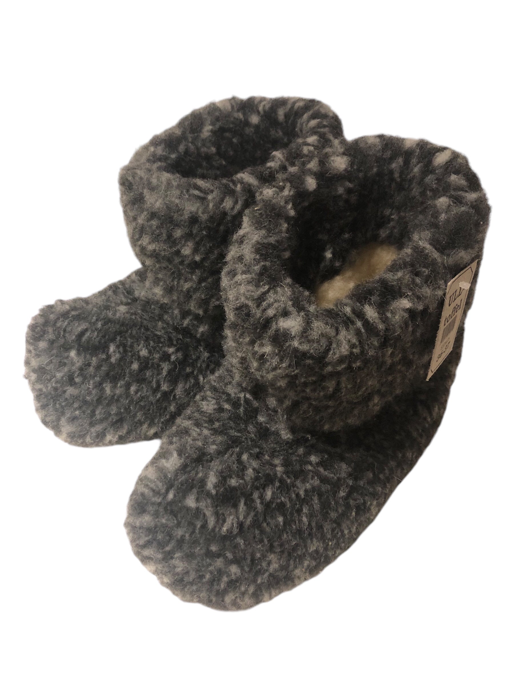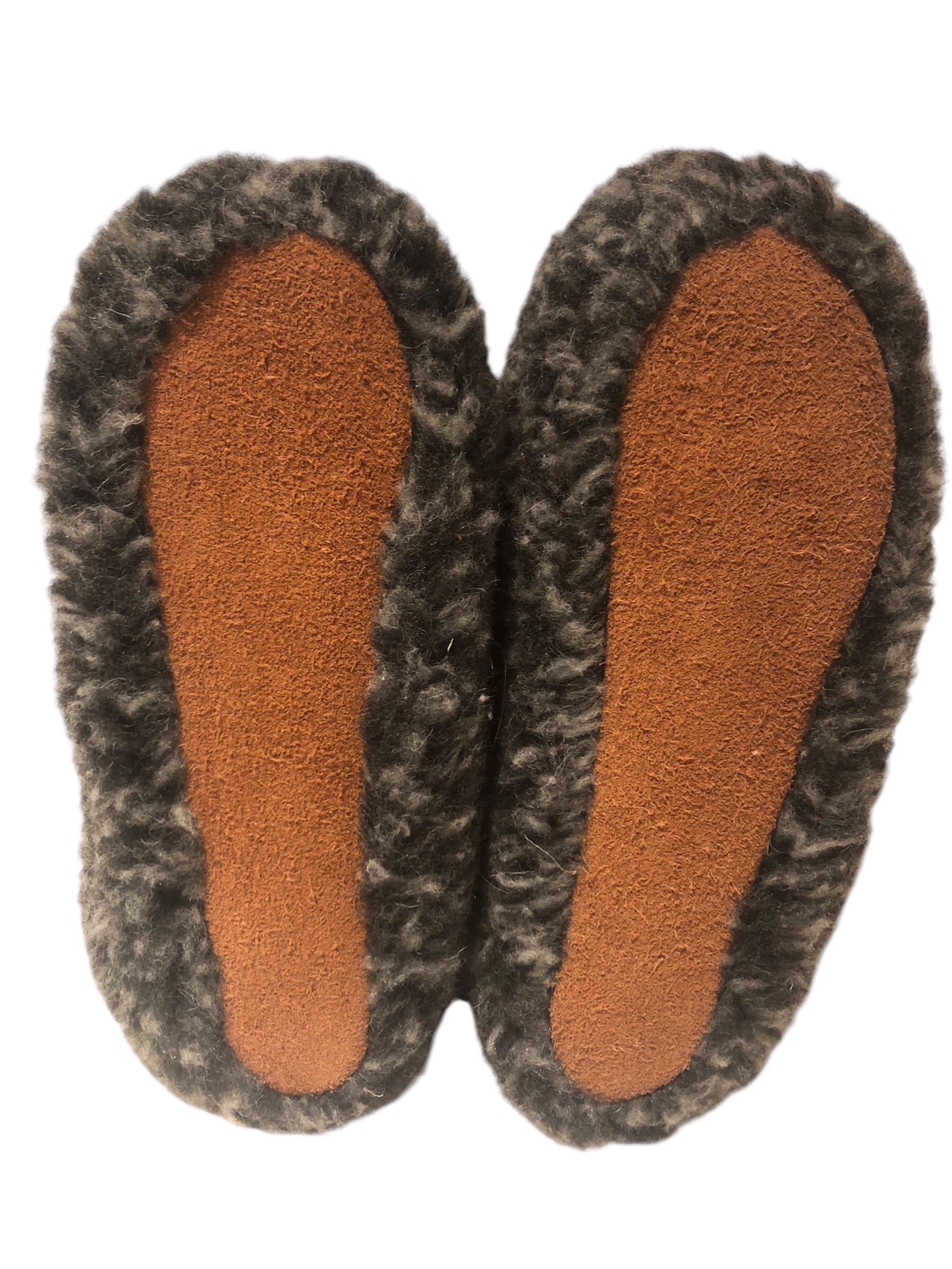 Fluffiga ulltofflor gråmelerade i 100% Merinoull med sula i mocka.